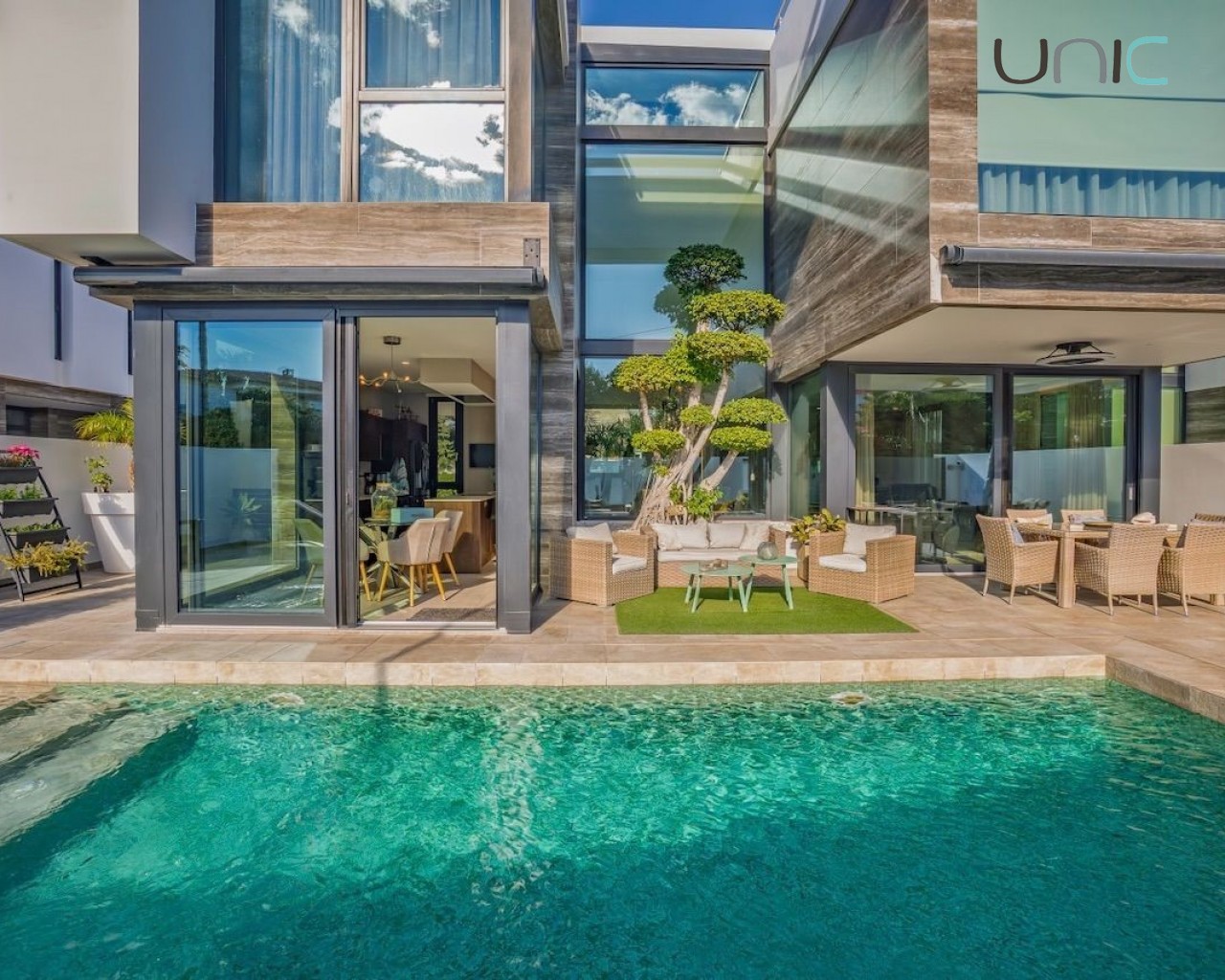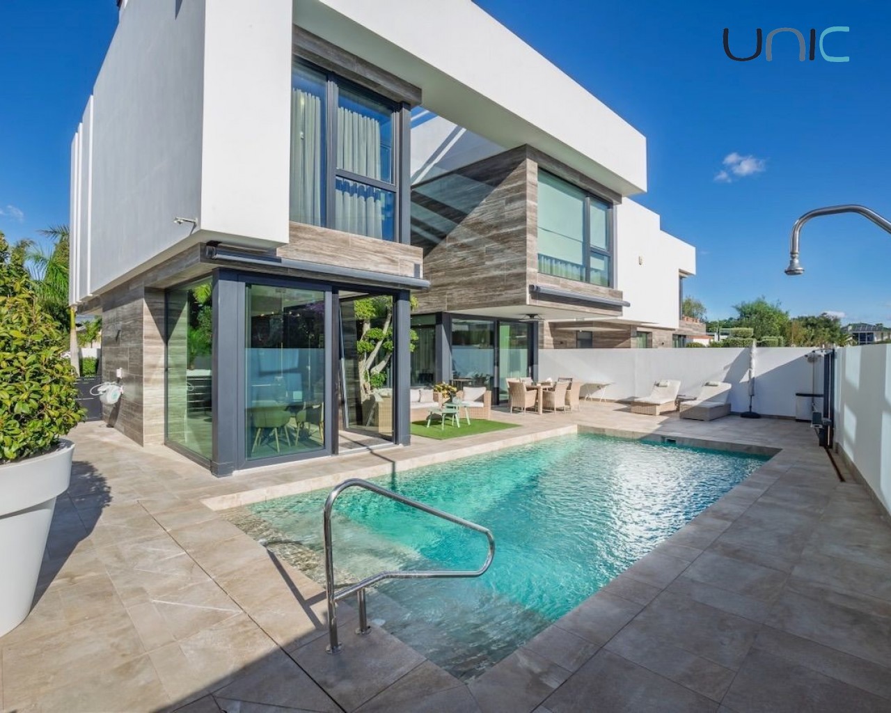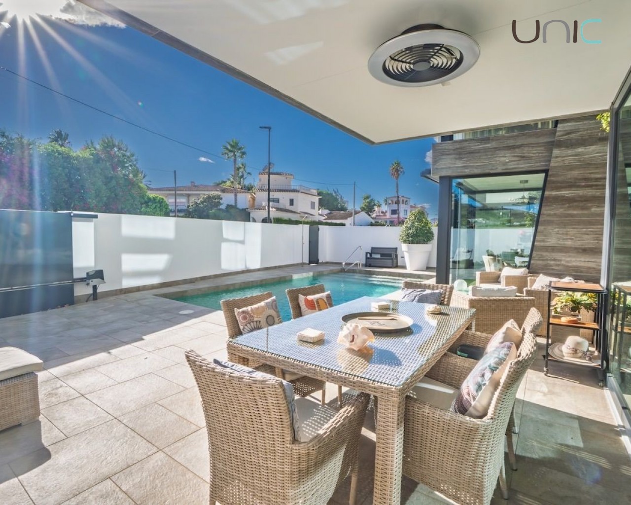 Villaen byr på en lettstelt hage med saltvannsbasseng og en herlig terrasse. Det er også en utendørs parkeringsplass med motorisert port.