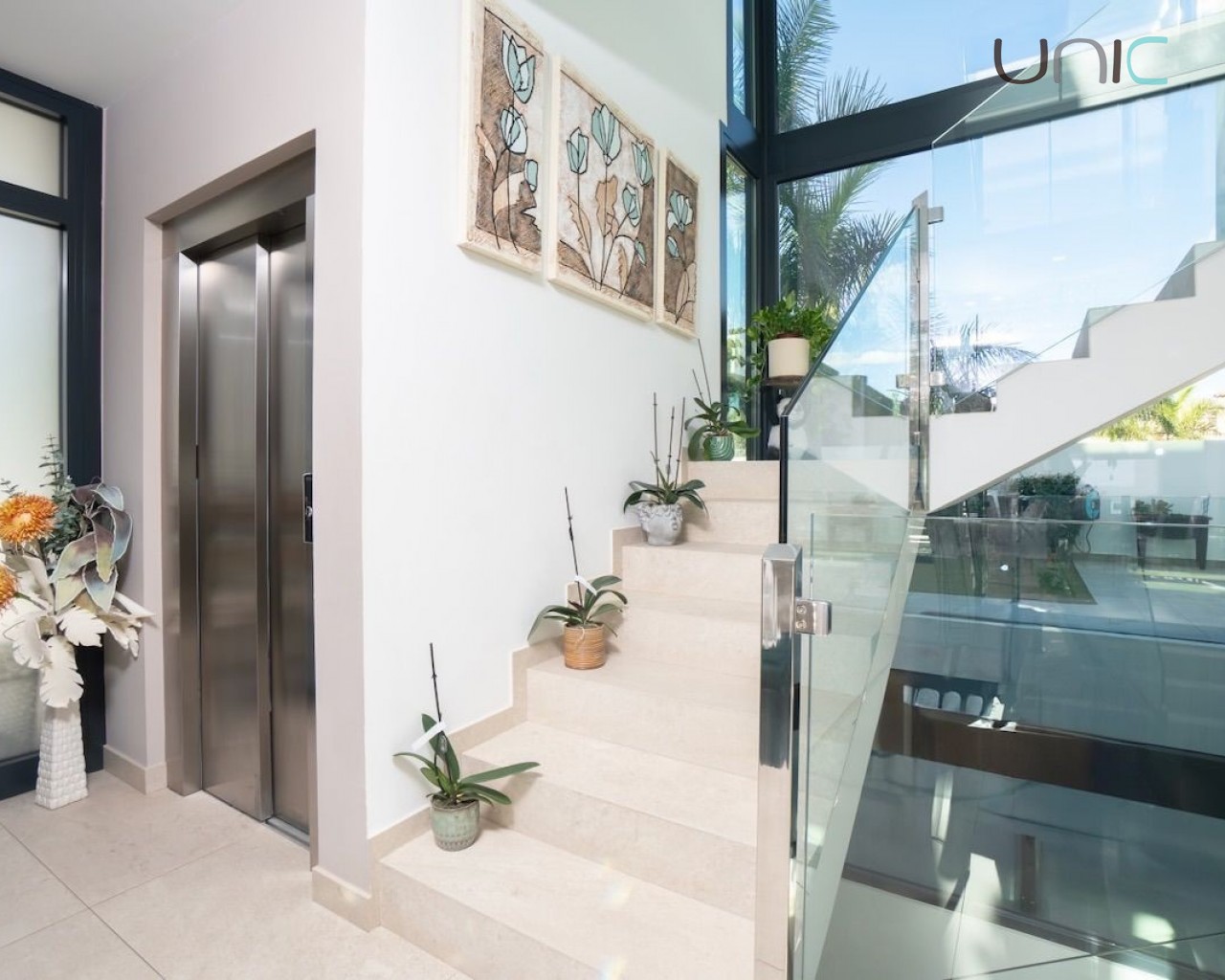 Alle etasjer er forbundet med en vakker innvendig trapp og en heis.