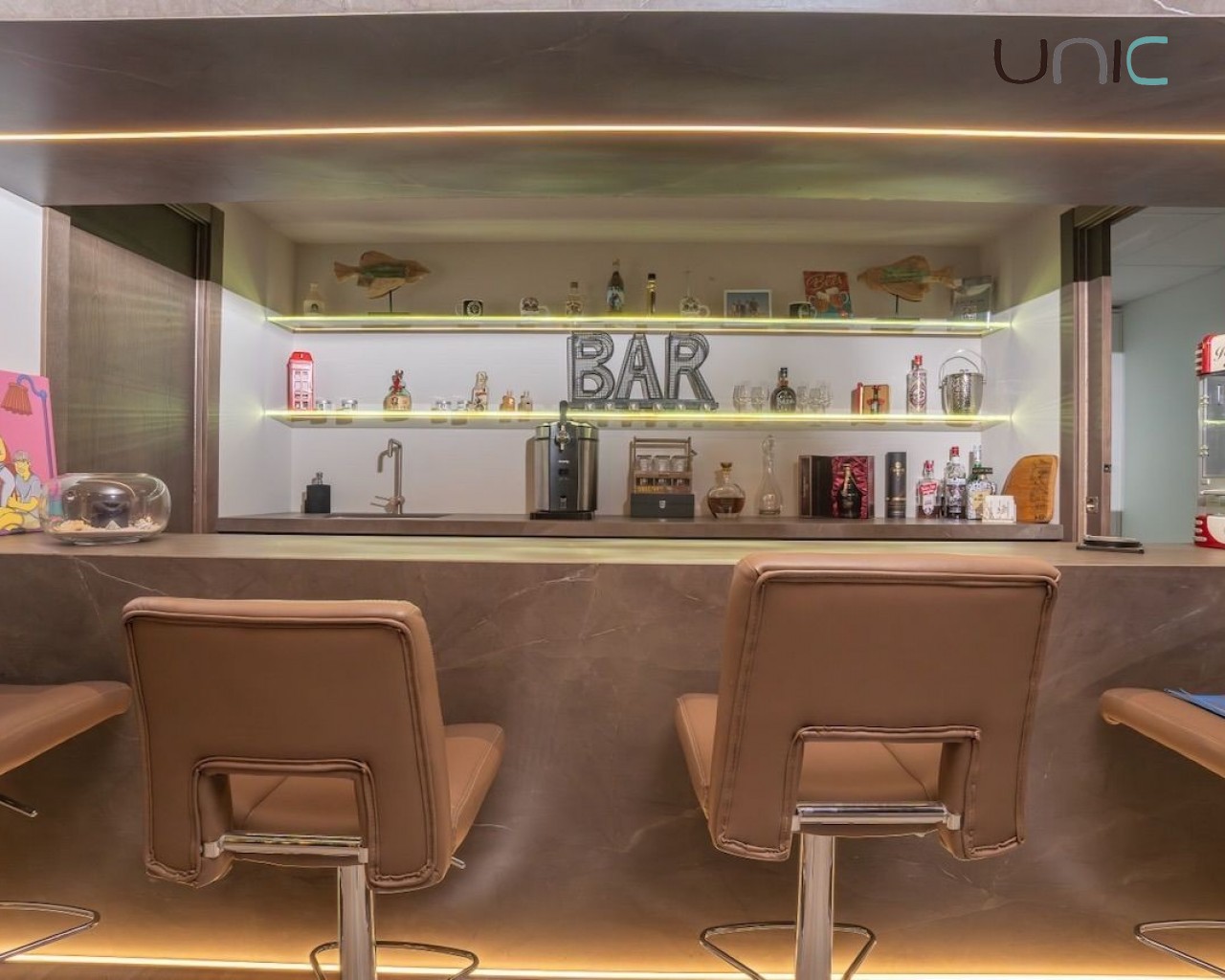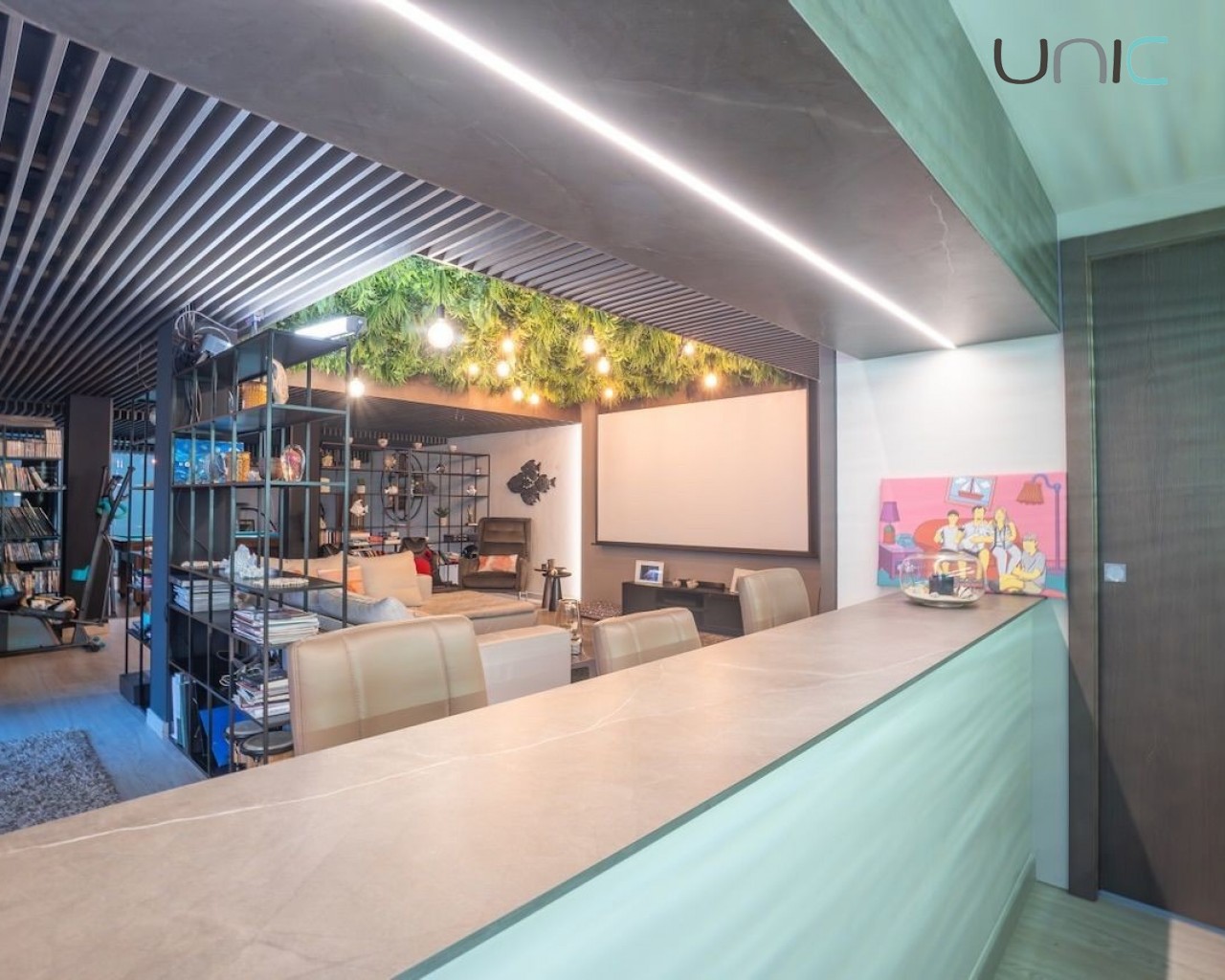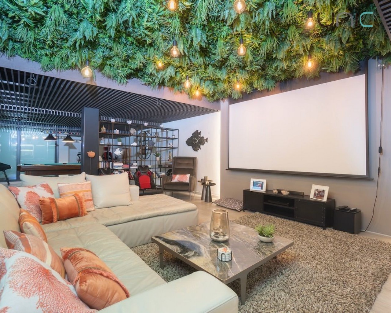 Villaen består av en hovedetasje, en øvre etasje med soverom, en takterrasse og en eksklusiv designerkjeller med et stort flerbruksrom med biljardområde, bar, kino, spiskammer og et komplett bad med dusj. Denne kjelleretasjen inkluderer en lys indre terrasse som gir rikelig med naturlig lys. Her finner man også vaskerom, bod og en romslig garasje.